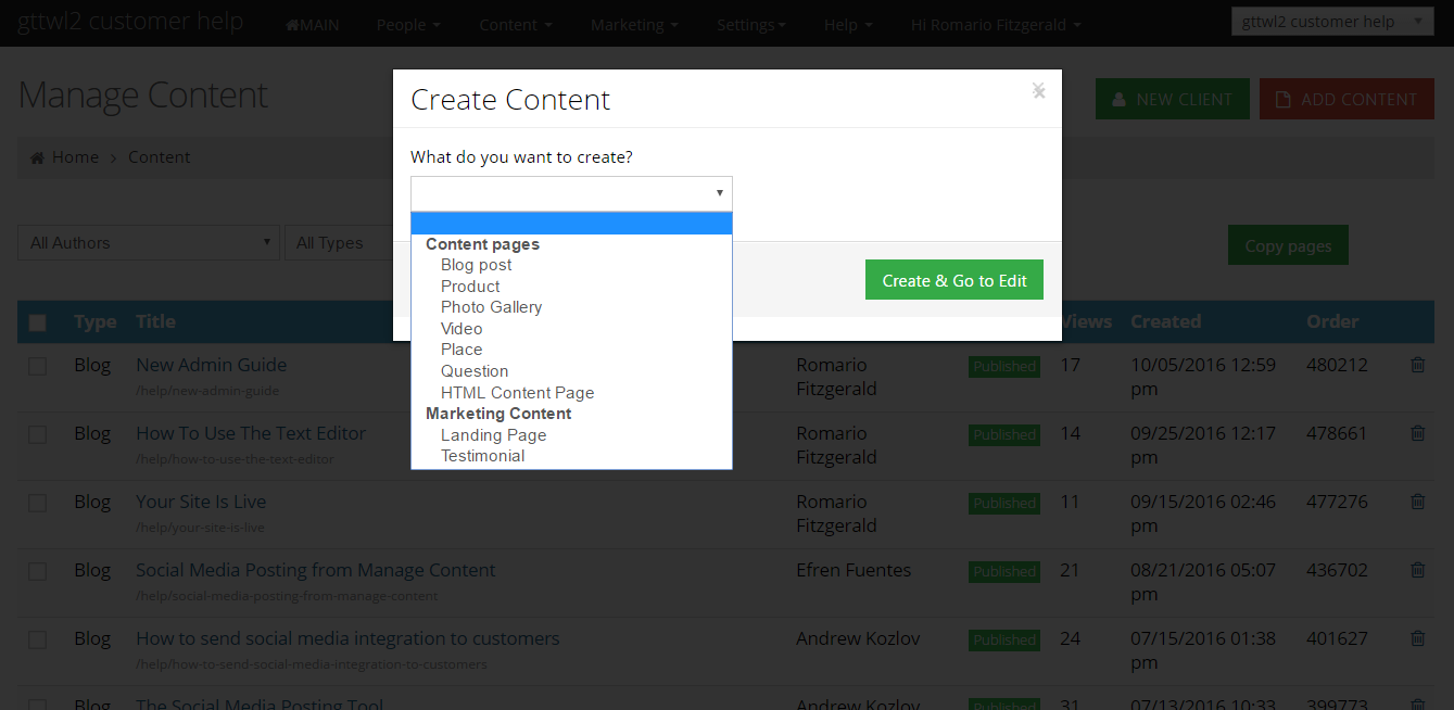 3. You will be presented with a pop up, which will ask what kind of content you want to create. Select the type you wish to create.