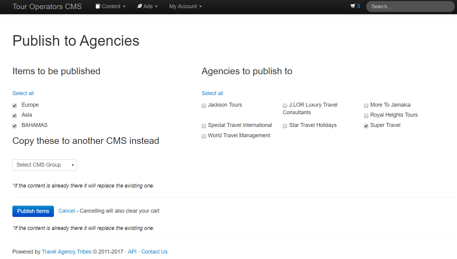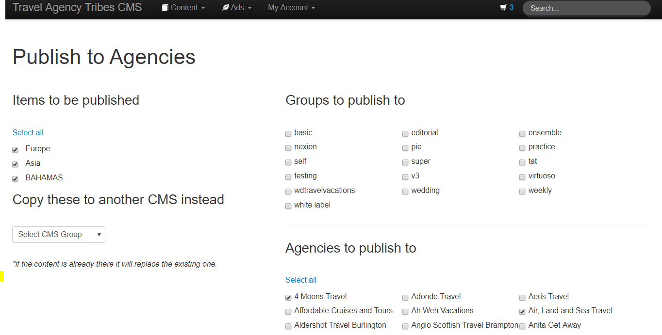 4. Click the cart to go to the publishing page and select the CMS you want to copy the posts to from the "Select CMS Group" dropdown, they will be copied to the CMS you select.
