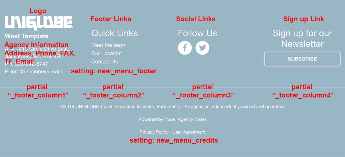At the end of the footer are the general links, for credits, privacy and terms. Similar to the second column you will be able to add new links via settings, creating a new setting "new_menu_credits" and adding the HTML code <li><a href="Menu Link">New Menu Item</a></li>, if you want to add more just repeat the same code.